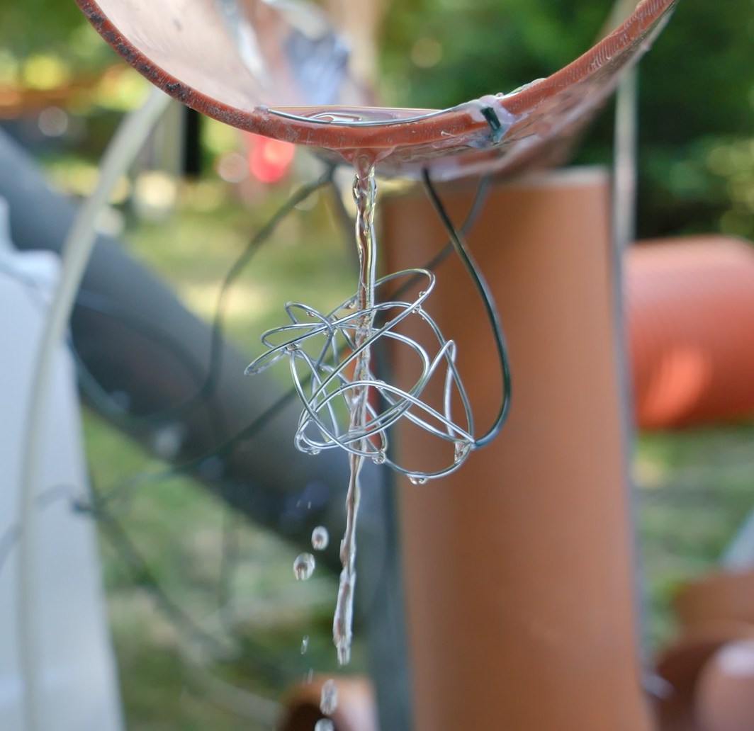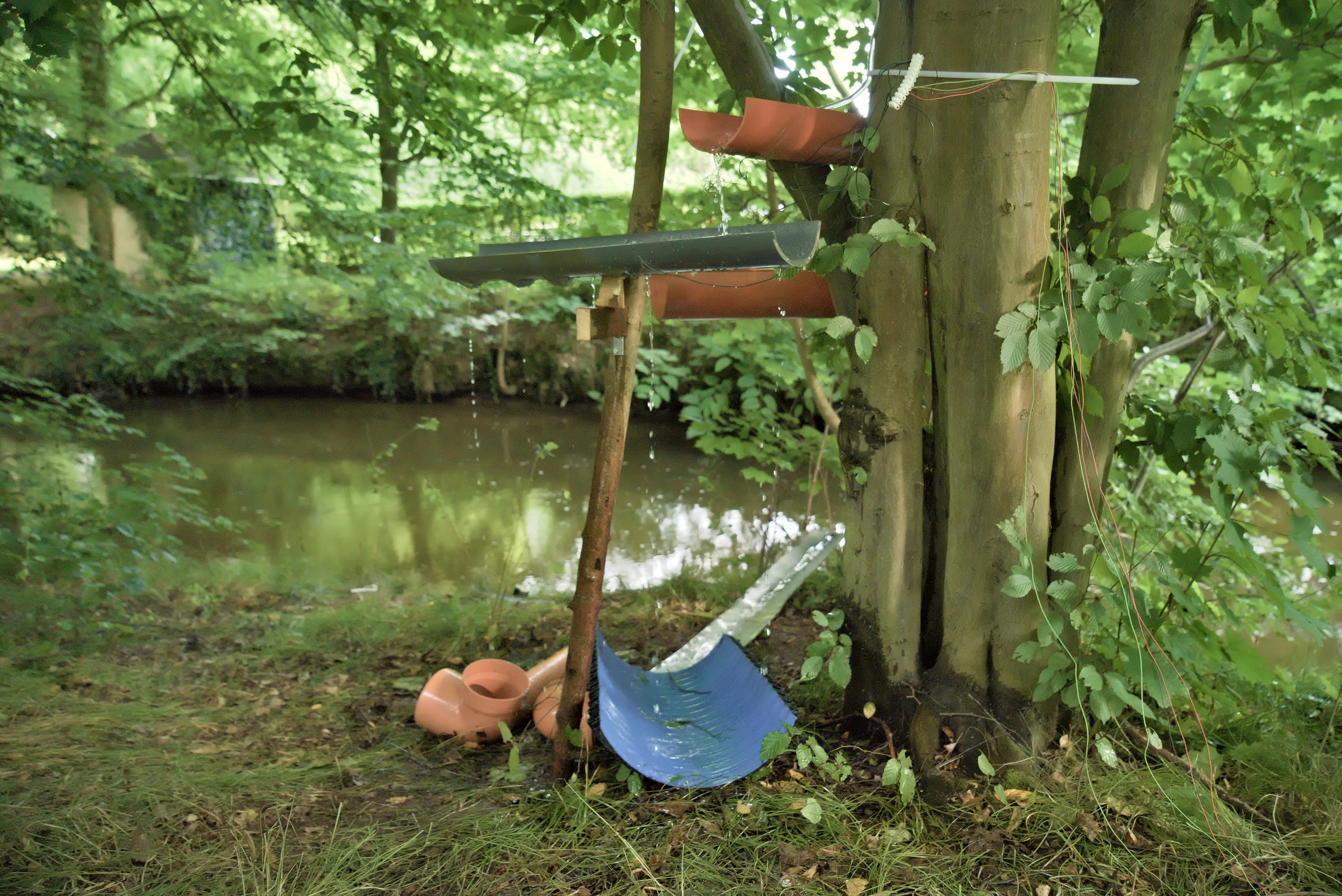 Water is a Dancer (2023) was temporarily installed in a castle park Großharthau in Germany. The work consists of a structure over which water flows. By placing metal wire at various points in the water’s flow that measure the electrical resistance, values are extracted that are converted into sound by custom software programming. The rhythm of the water is translated into sound, and use e.g. sound sources from dance music (amen-break sampling). One interacts with the work by changing the water flow with the hands and thus controlling the soundscape. It feels good to control sound by water.