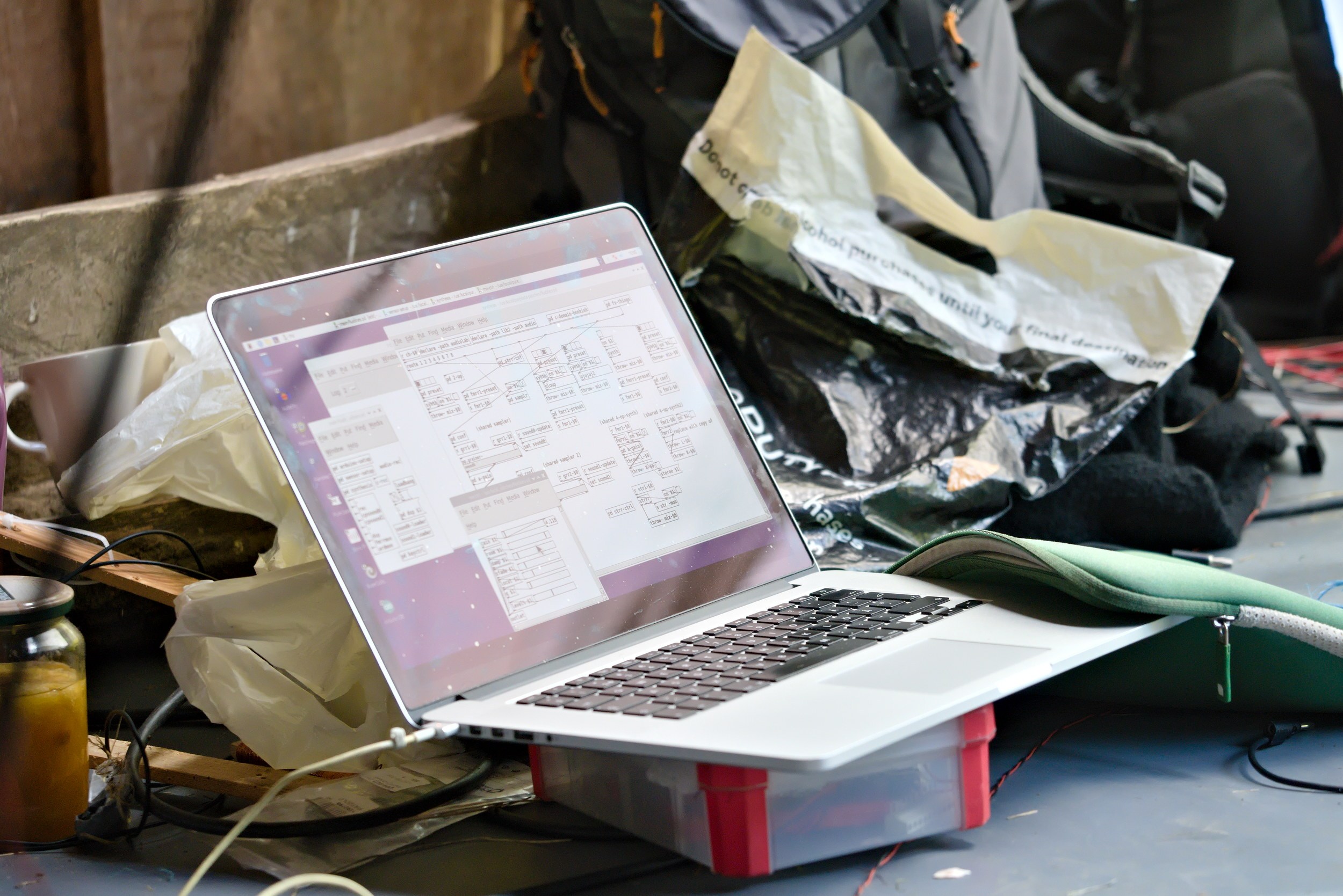 Materials: Sound synthesis, interactive design, computer, speakers, metal wire (sensors), microcontrollers, wires, water, pump, plastic