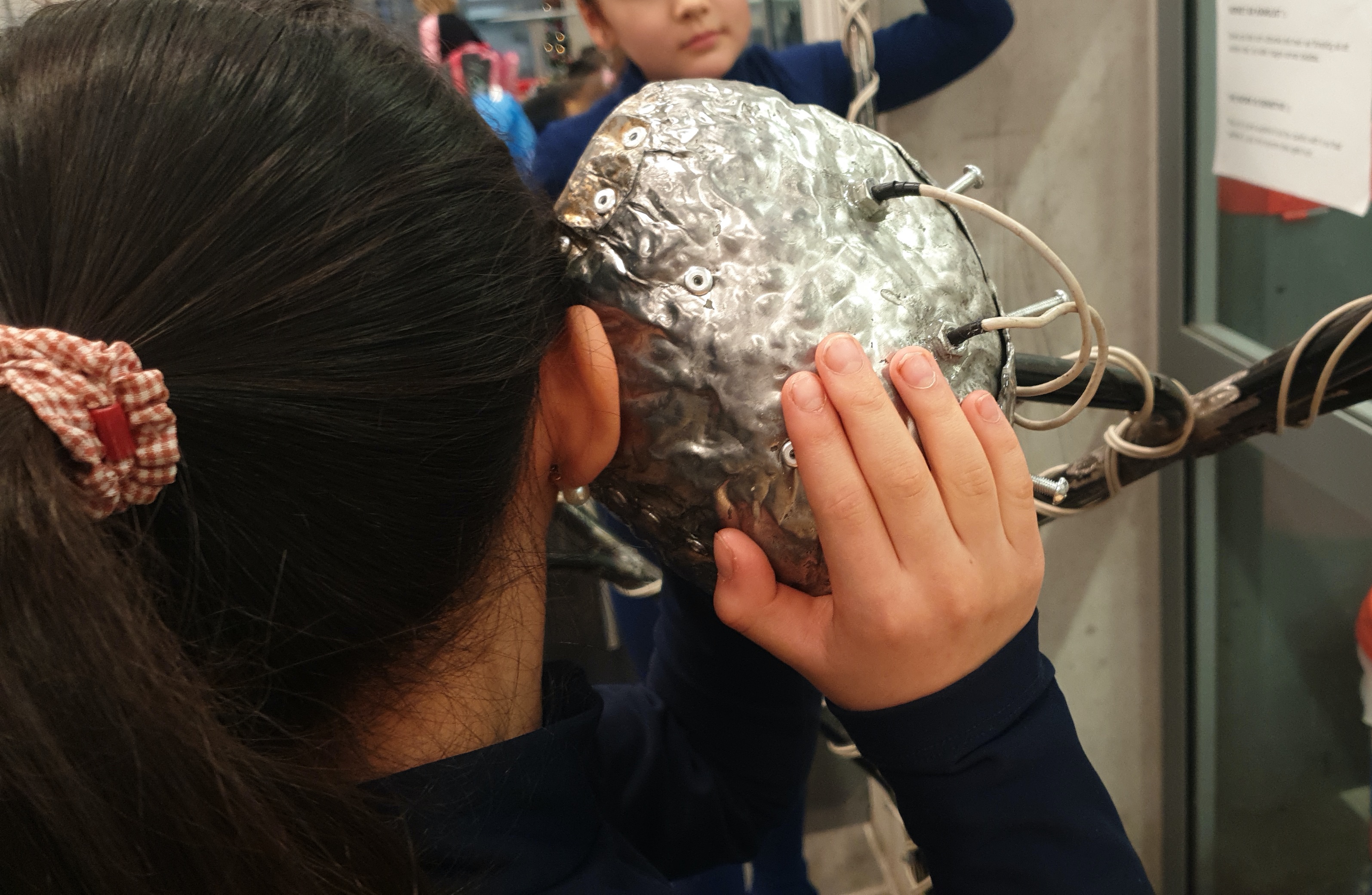 The installation featured a heat-sensitive sculpture that visitors could interact with by generating various types of sounds through warming it. Accompanying this was text, conveying that the work was about empathy and climate, and providing information along with images suggesting different ways to interpret the piece. Visitors also had the opportunity to share their interpretations by scanning a QR code leading to a form.