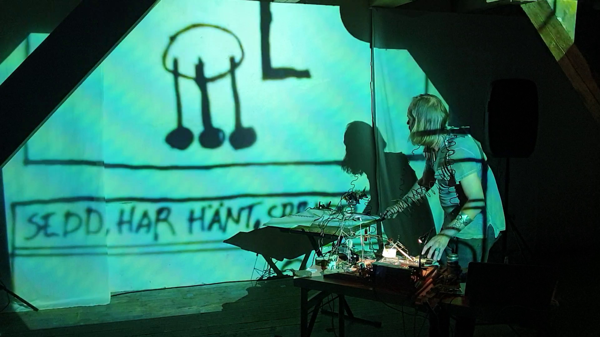 With the work Neurotic Network Training, I aim to explore self-optimization and stress, placing it in relation to our digital society. The intention is to continuously introduce new elements into the work, such as images, sounds, texts, and physical and digital tools to handle them, and then process this live in a performance. I experiment with dressing up, entangling myself in my interface – blurring the boundary between me and technology – and using my body as input in the system. The title of the work plays with the concept of artificial neural networks in computer technology. I try to find the simple and primitive solutions in the system I have created, updating and changing bit by bit what I feel is most critical. In the performances I have done so far with this work, I have used the visual poetry of concrete poet Jarl Hammarberg-Åkesson as visual raw material, as well as sound samples from musician Tommie Lundberg, individuals I am both related to and who have greatly influenced my artistic practice.